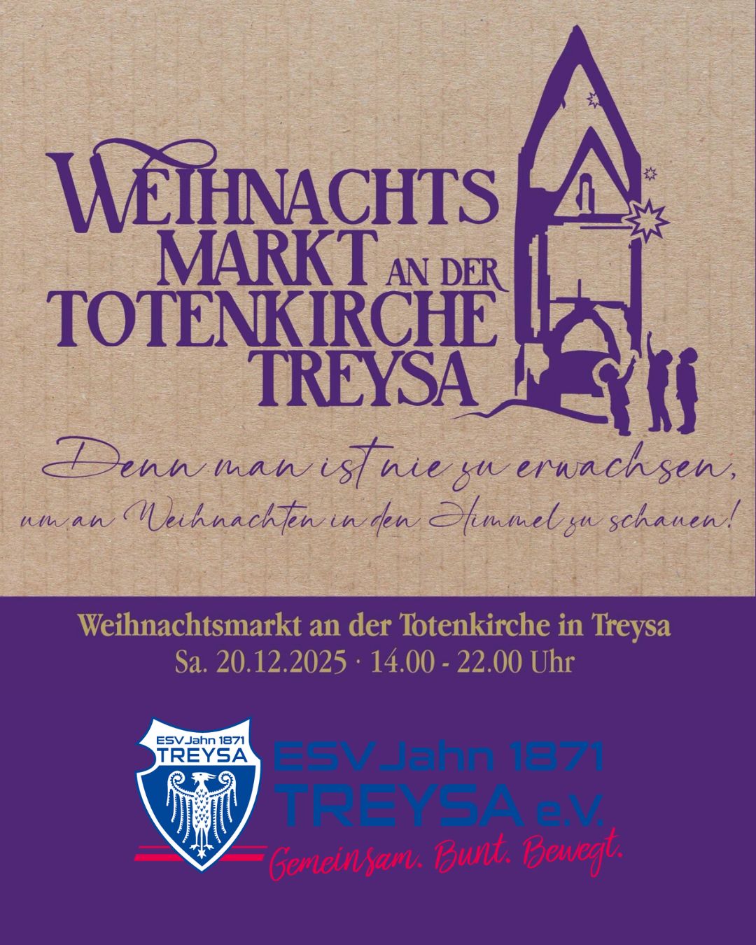 Der ESV Jahn Treysa ist bereits in Weihnachtsstimmung und freut sich euch verkünden zu dürfen, dass wir dieses Jahr erneut einen Stand auf dem Weihnachtsmarkt an der Totenkirche in Treysa haben werden. Wie im vergangenen Jahr könnt ihr euch an unserem Stand mit einem heißen Aperol oder einem heißen Orangensaft aufwärmen.
